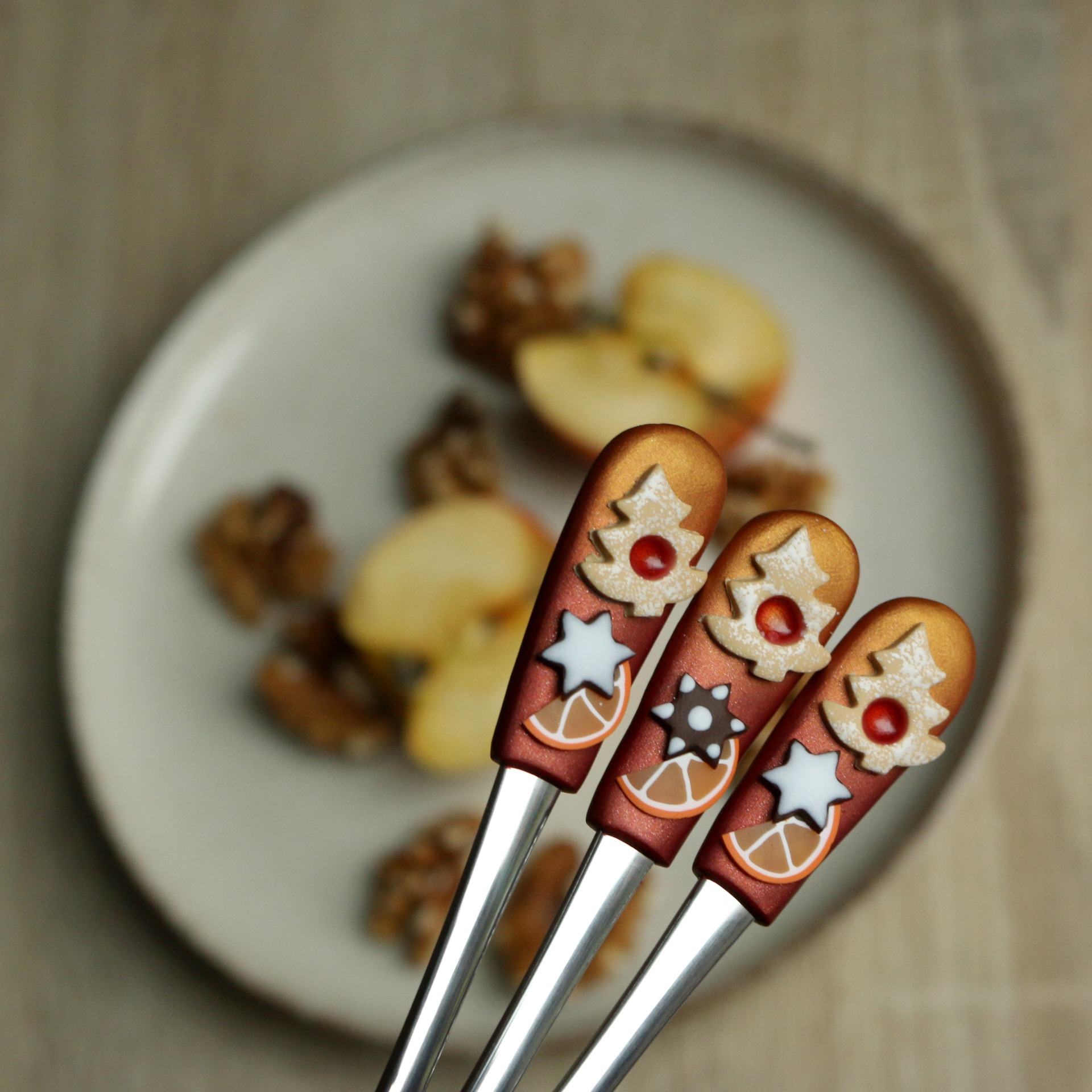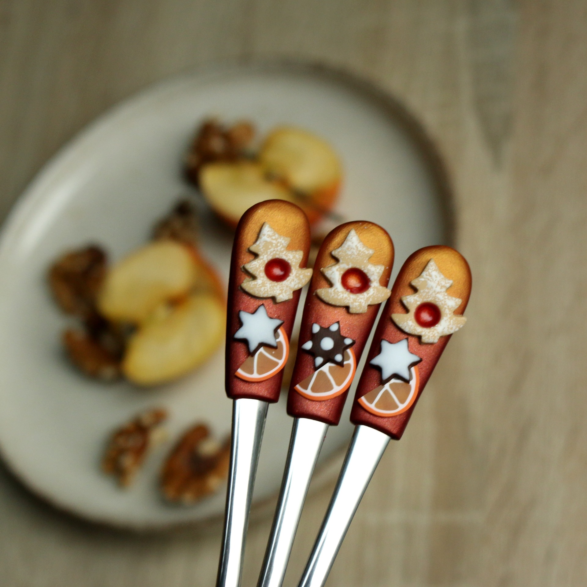 Lžičky z nerezové oceli dekorované polymerovou hmotou. Nemýt v myčce!! Lze mýt v ruce jakýmkoli prostředkem na nádobí.